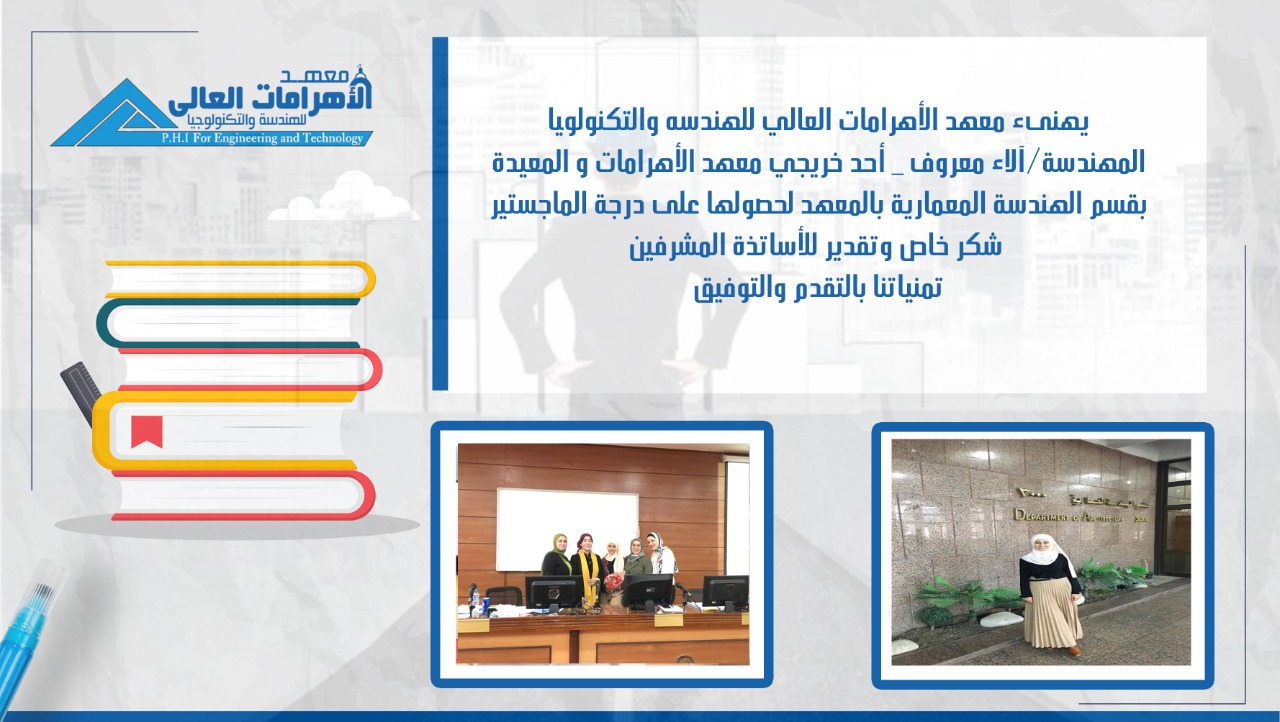 يهنىء معهد الأهرامات العالي للهندسه والتكنولوچيا المهندسة/آلاء معروف _ أحد خريجي معهد الأهرامات و المعيدة بقسم الهندسة المعمارية بالمعهد لحصولها على درجة الماجستير.. شكر خاص وتقدير للأساتذة المشرفين . تمنياتنا بالتقدم والتوفيق..