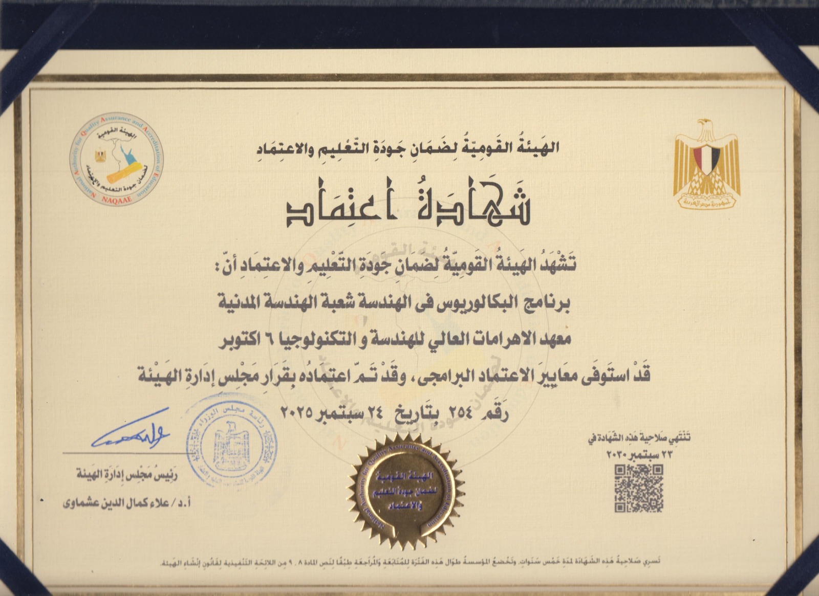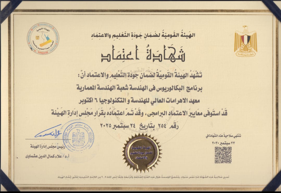 اعتماد برنامجي الهندسة المدنية و الهندسة المعمارية من الهيئة القومية لضمان جودة التعليم و الاعتماد NAQAAE بجلسة ٢٤-٩-٢٠٢٥ … مزيدًا من النجاحات فى المستقبل.