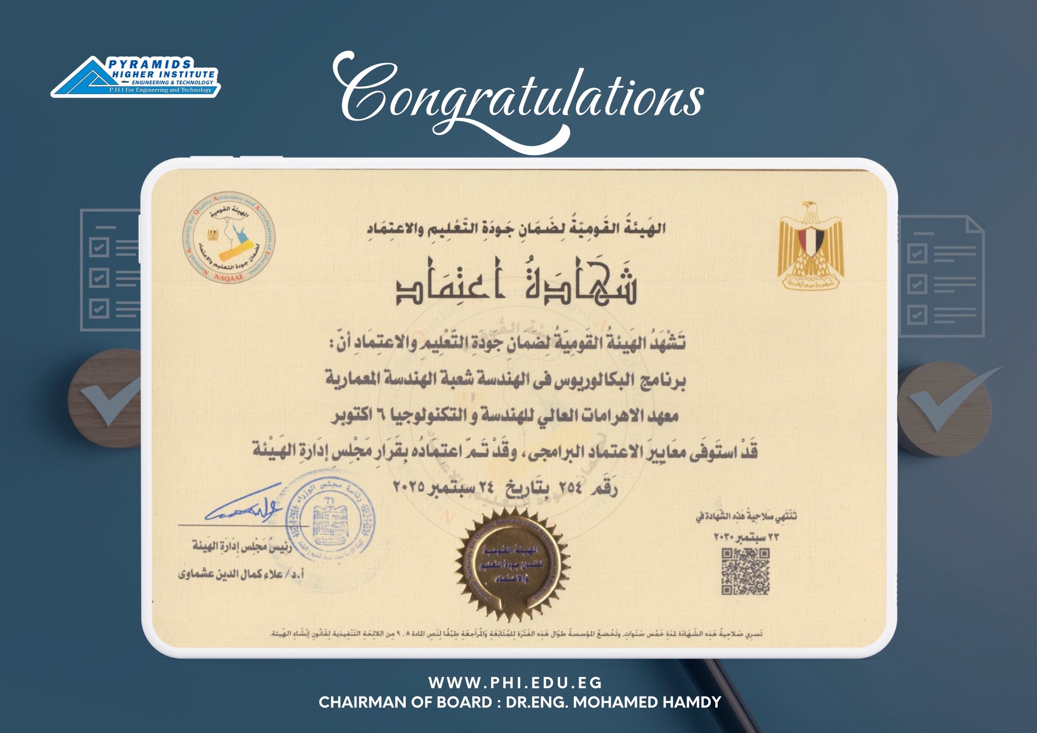 اعتماد برنامج البكالوريوس في الهندسة المعمارية بمعهد الأهرامات العالي للهندسة والتكنولوجيا – 6 أكتوبر، صادرة عن الهيئة القومية لضمان جودة التعليم والاعتماد بعد استيفاء البرنامج لمعايير الاعتماد وذلك بجلسة 24 سبتمبر 2025.